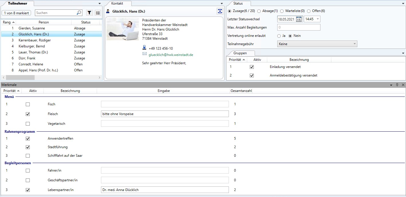 EVENT unterstützt Sie bei der Planung, Organisation und Durchführung von Veranstaltungen aller Art. Behalten Sie von der Aufgabenplanung, Einladung, Budgetkontrolle bis hin zum Teilnehmermanagement jederzeit den Überblick. Mit der Online-Anmeldung und Zugangskontrolle via QR-Code hinterlassen Sie einen nachhaltigen Eindruck.
